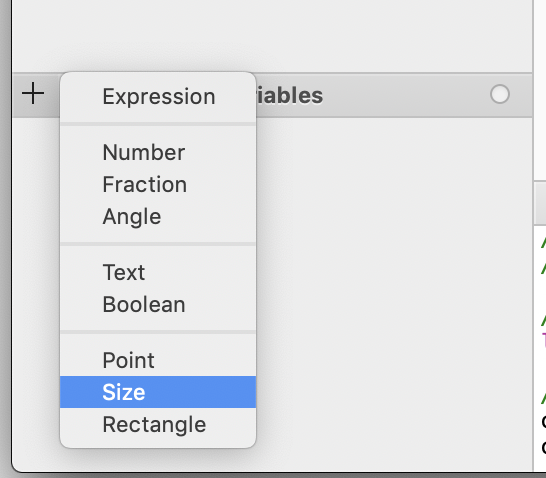 좌측 하단에 Variable 패널 "+" 버튼을 누르고 Size를 선택합니다.