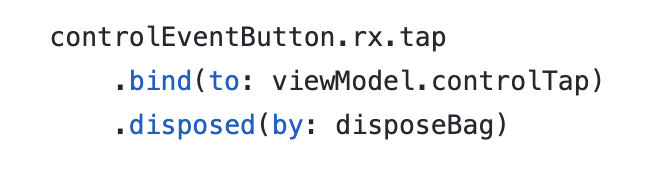 위에 예제는 UIButton의 tap 이벤트가 클릭되었을 때 ViewModel의 controlTap 의 이벤트로 DataBinding 하는 과정입니다.