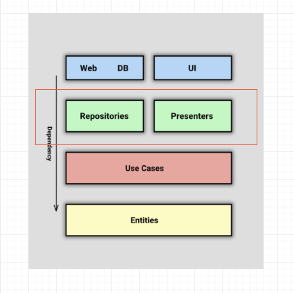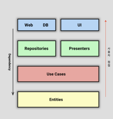 각 UI, Presenter, Use Cases, Entities 의 Layer 가 존재하며 의존성에 방향이 아래로 향하고 있는 것을 알 수 있습니다.
