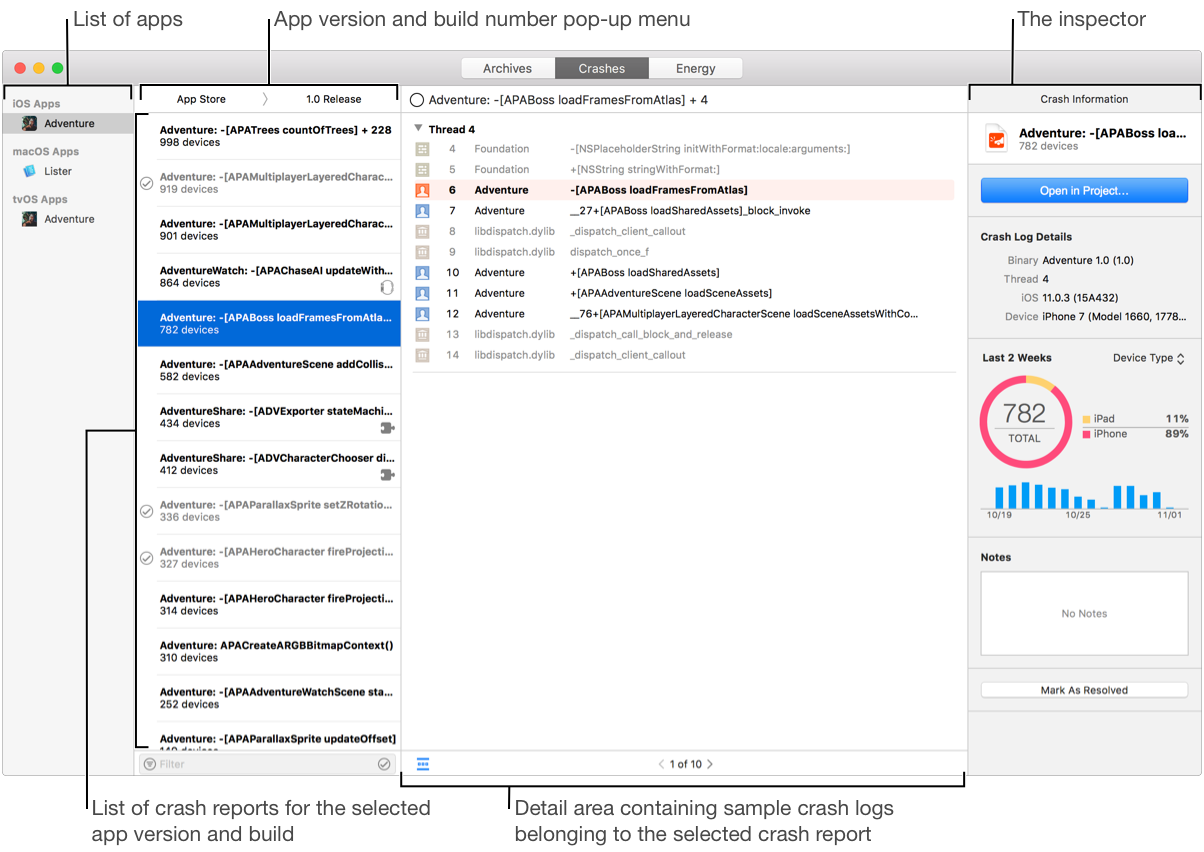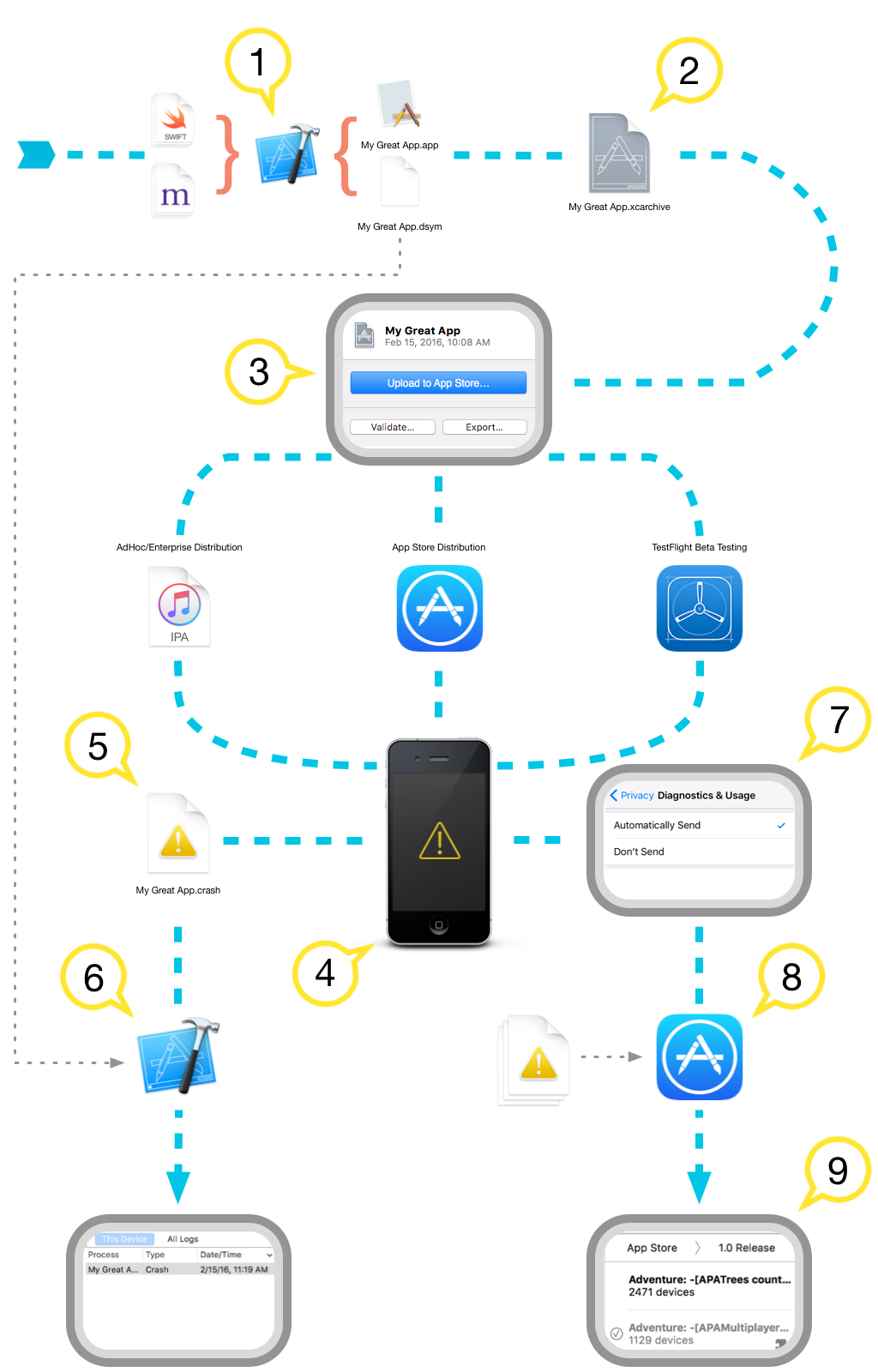 7. 사용자가 Apple과 진단 데이터를 공유하도록 선택했거나 TestFlight를 통해 베타 버전의 애플리케이션을 설치 한 경우 충돌 보고서가 App Store에 업로드됩니다.