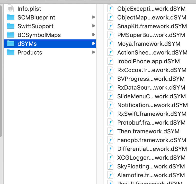 디버그 정보 형식(DEBUG_INFORMATION_FORMAT) 빌드 설정에 따라 이러한 디버그 기호는 이진 파일 내부 또는 동반 디버그 기호(dSYM) 파일에 저장된다. 기본적으로, DEBUG는 컴파일된 바이너리 안에 디버그 기호를 저장하는 반면, Application의 Build는 2진수 크기를 줄이기 위해 동료 dSYM 파일에 디버그 기호를 저장한다 Debug Symbol file과 애플리케이션 이진 파일은 빌드 UUID에 의해 빌드 기준 별로 묶여 있다.