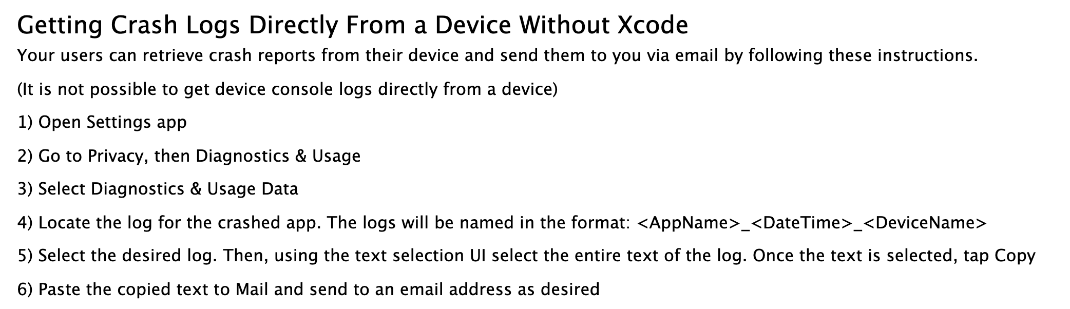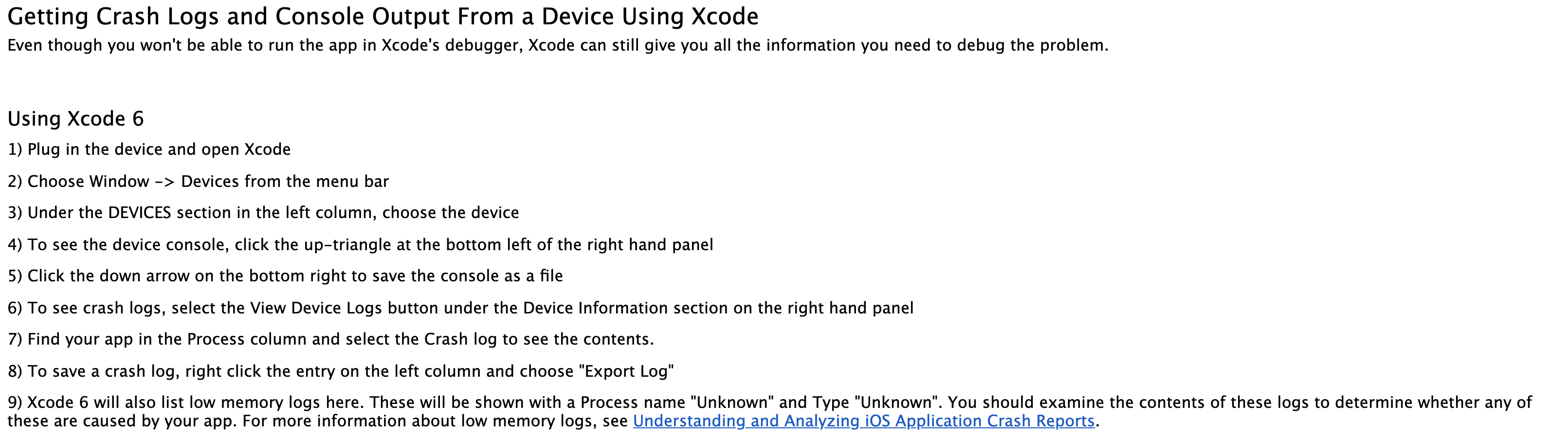 5. 사용자는 배포된 iOS 앱 디버깅의 단계를 수행하여 장치에서 직접 충돌 보고서를 검색할 수 있다. AdHoc 또는 Enterprise 배포를 통해 애플리케이션을 배포한 경우 사용자로부터 충돌 보고서를 획득할 수 있는 유일한 방법은 이 방법뿐입니다.
