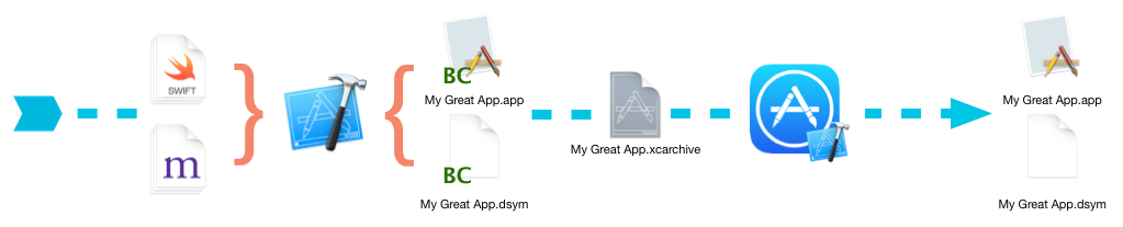 응용 프로그램의 각 빌드에 대해 새 UUID가 생성되고 해당 빌드를 고유하게 식별하십시오. 기능적으로 동일한 실행 파일을 동일한 소스 코드로 재 구축하더라도, 동일한 컴파일러 설정으로 다른 빌드 UUID를 갖게 된다. 동일한 원본 파일에서도 후속 빌드의 기호 파일을 디버깅하면 다른 빌드의 이진 파일과 상호 운용되지 않는다. - 배포를 위해 응용 프로그램을 보관하면 Xcode는 .dSYM, 응용 프로그램 바이너이를 수집하여 홈 폴더 내의 위치에 저장한다.