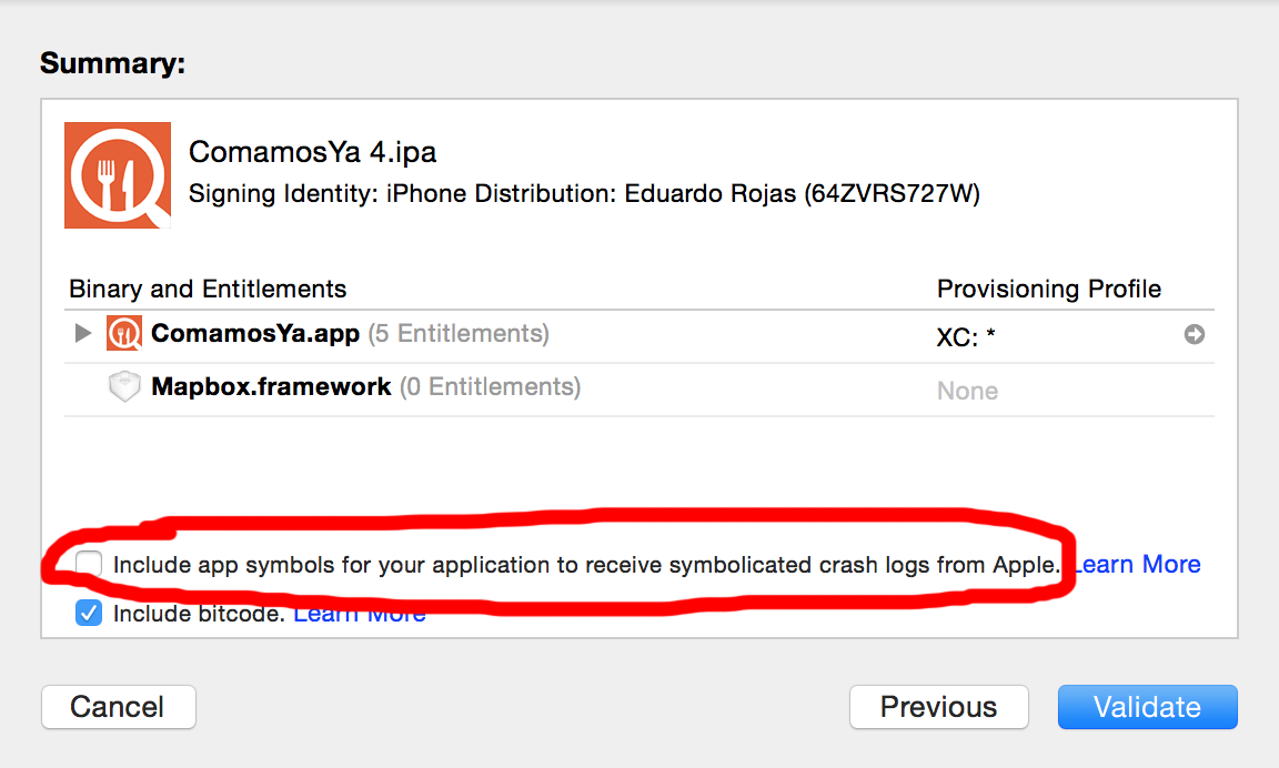 3. App Store를 통해 앱을 배포하거나 Test Flight를 사용하여 베타 테스트를 수행하는 경우 iTunes Connect에 보관 파일을 업로드 할 때 dSYM 파일을 포함 할 수있는 옵션이 제공됩니다. 제출 대화 상자에서 'Include app symbols for your application'을 선택하십시오. 진단 데이터를 공유하기로 선택한 TestFlight 사용자 및 고객으로부터 수집 한 충돌 보고서를 받으려면 dSYM 파일을 업로드해야합니다.