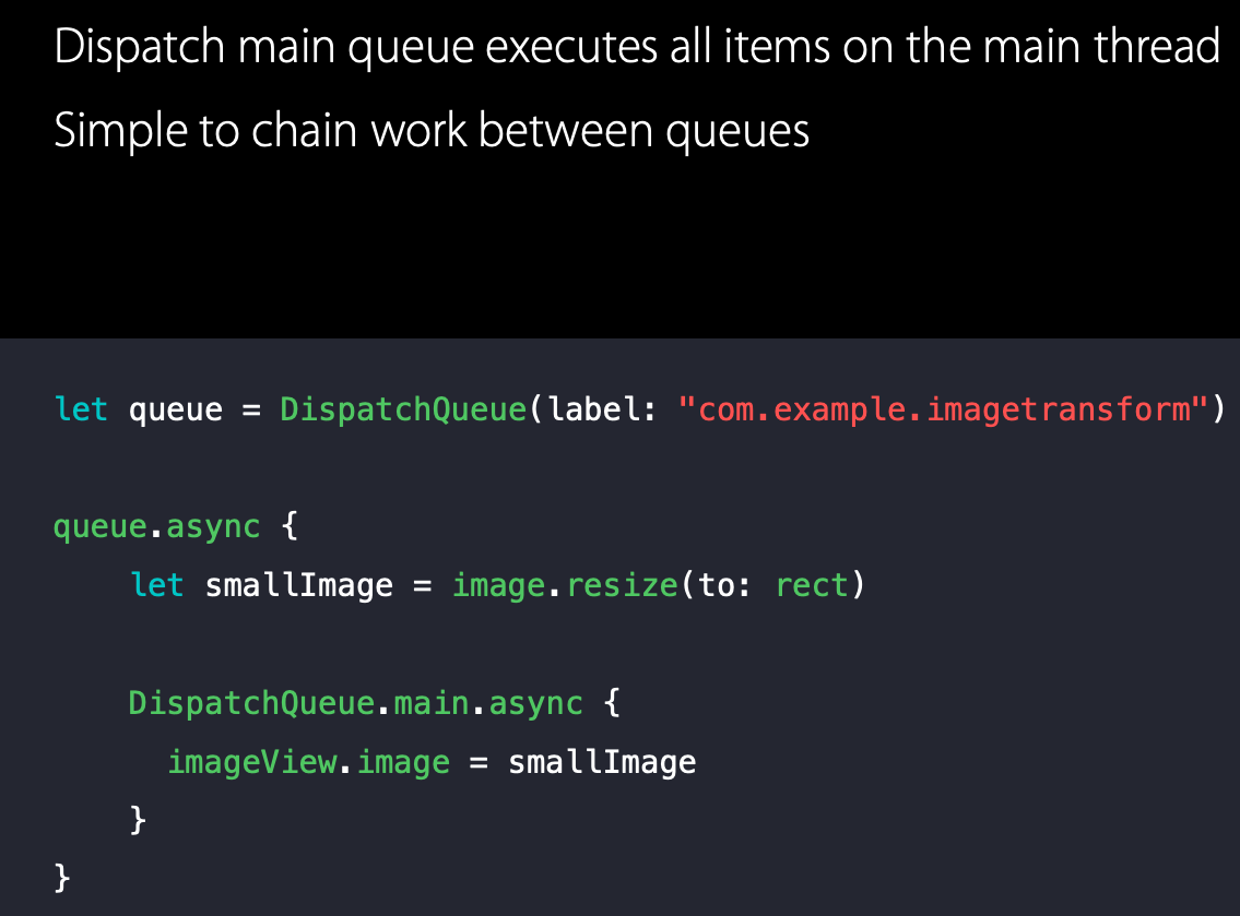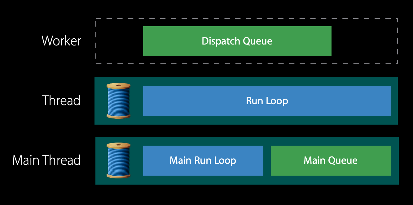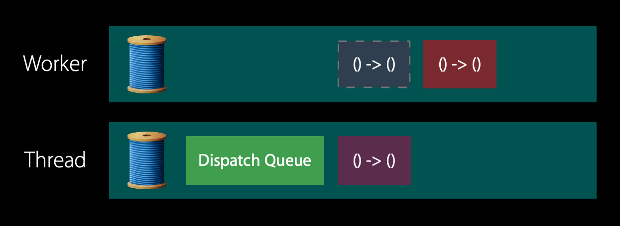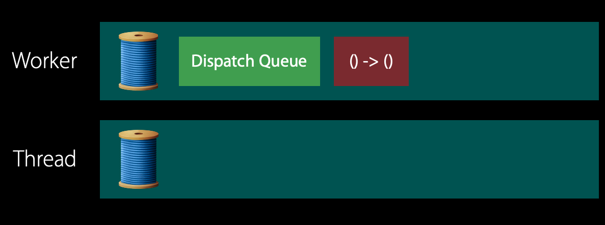 DispatchQueue는 대기중인 스레드로 제어를 전달하고 해당 항목을 실행 한 다음 DispatchQueue의 제어가 디스패치에 의해 제어되는 작업자 스레드로 다시 리턴됩니다.