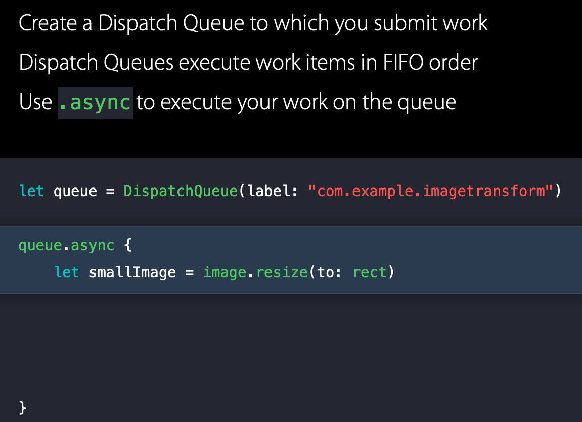 그 DispatchQueue에서 .async 메소드를 사용하여 해당 큐에 작업을 제출할 수 있습니다.