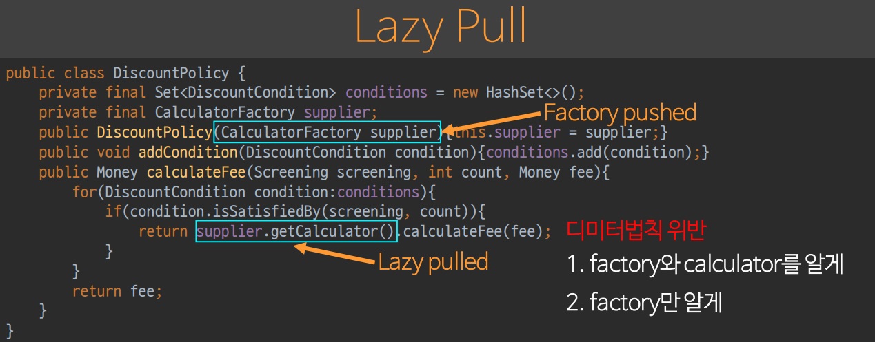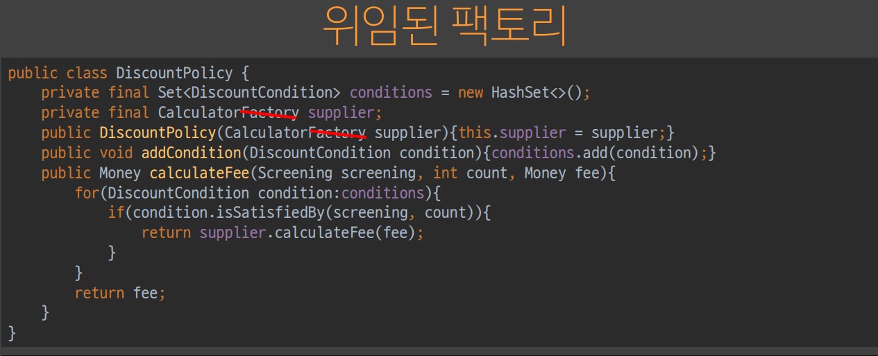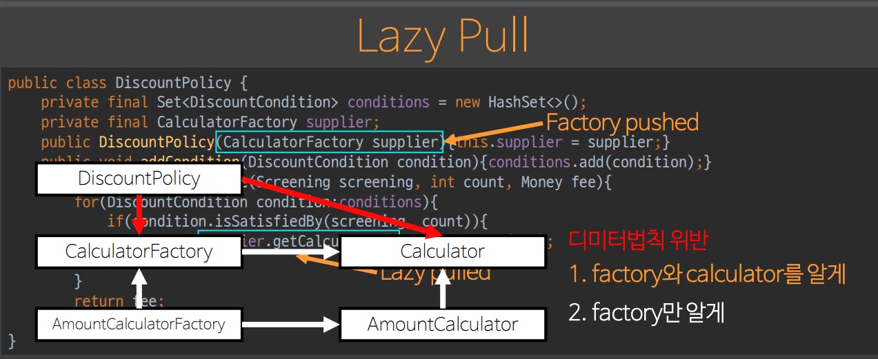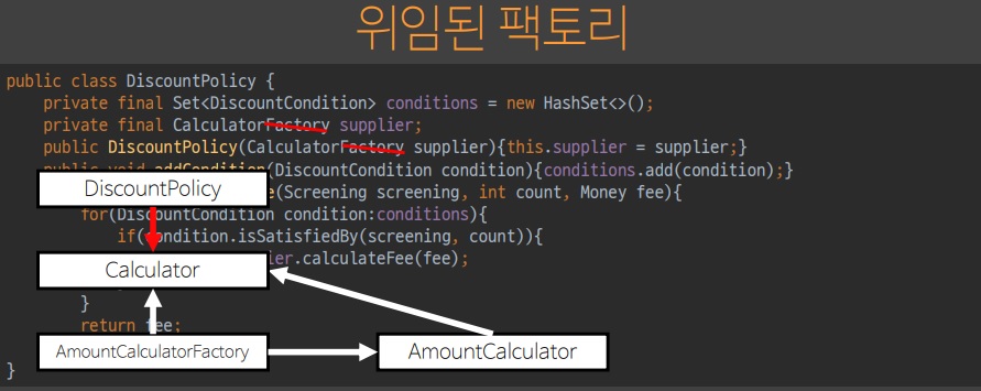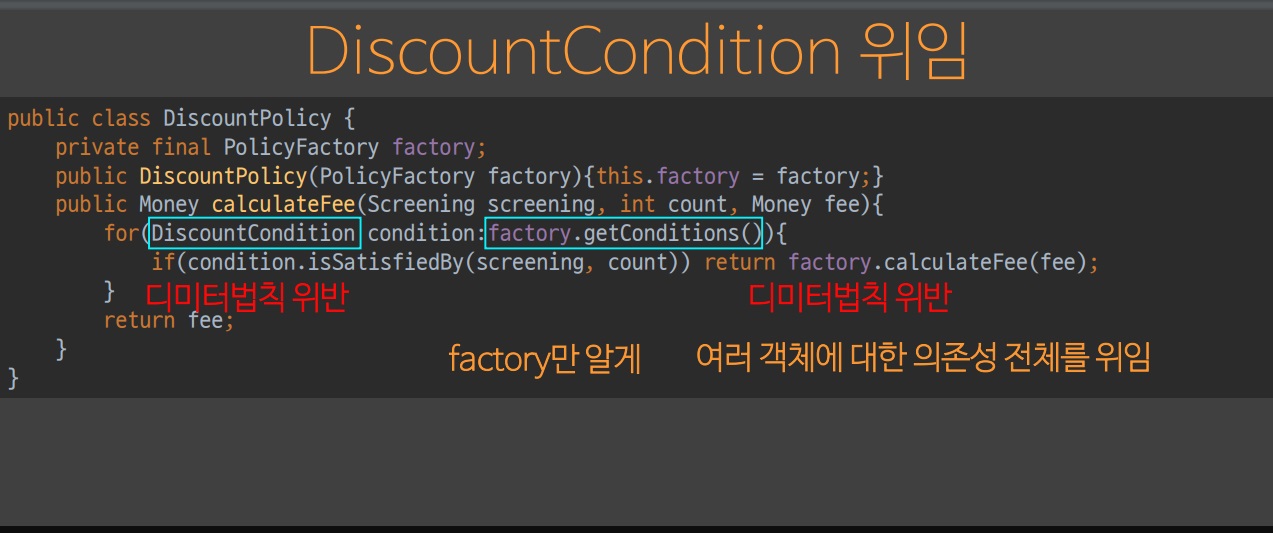 원래부터 Factory 는 DiscountCondition 을 알고 있었기 때문에 디미터의 원칙을 만족할 수 있다.