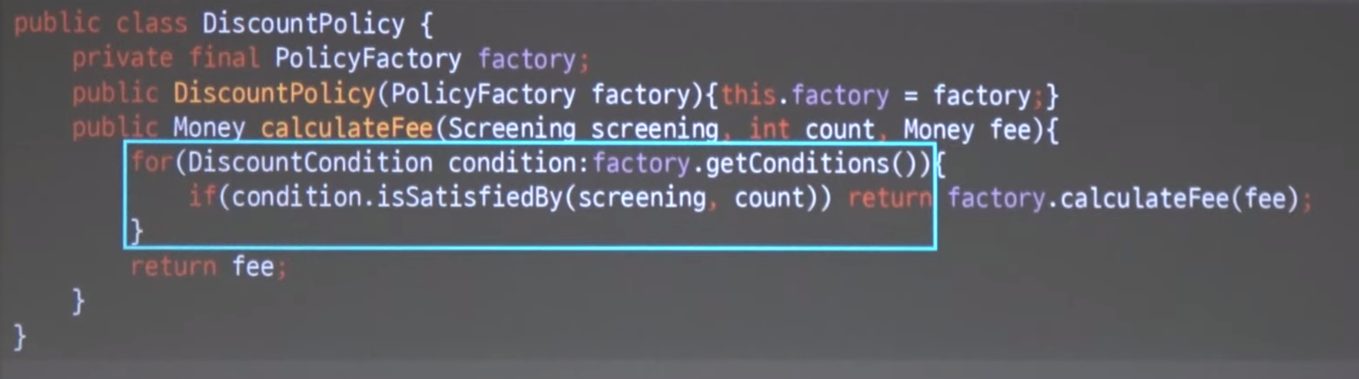 for (: factory.getConditions()) 는 어떤 condition 을 반환할지 모르기 때문에 디미터의 법칙을 위반한다.
