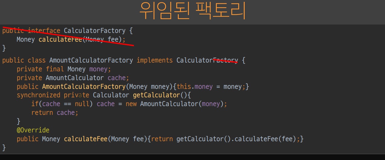 Factory 만 알도록 하기 위해선 caculateFee 자체를 위임해야 한다.