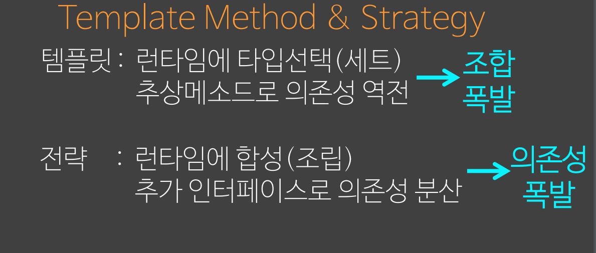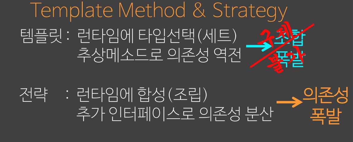 보통은 Strategy pattern 으로 시작해서 유연성을 충분히 확보하고 안정화 됐다고 생각하면 Template method pattern 으로 바꾼다.