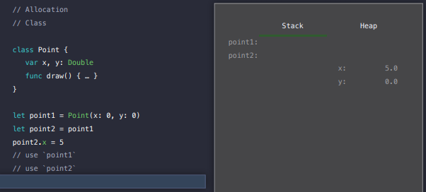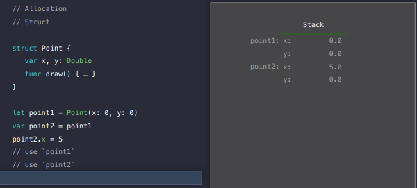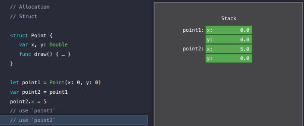point는 구조체이기 때문에 x와 y 속성은 스택에 할당됩니다.