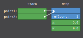 point1을 point2에 할당 할 때 point1이 struct 와 달리 class 는 point가 복사되지 않습니다.