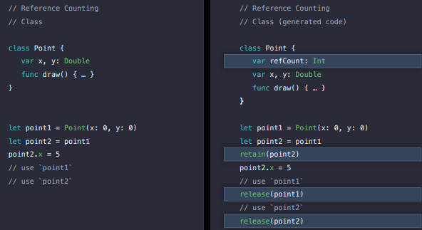 클래스는 힙에 할당되므로 Swift는 해당 힙 할당의 수명을 관리해야합니다.