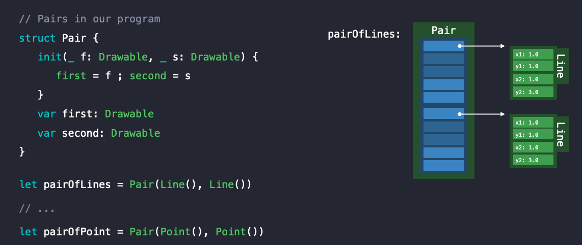 Line과 같은 큰 값은 다시 힙에 저장되며 로컬 Existential Container 내부의 해당 메모리에 대한 포인터를 저장합니다.