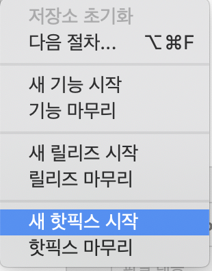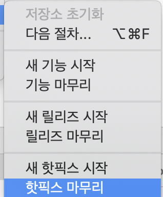저장소 -> Git flow / Hg flow -> 새 핫픽스 시작