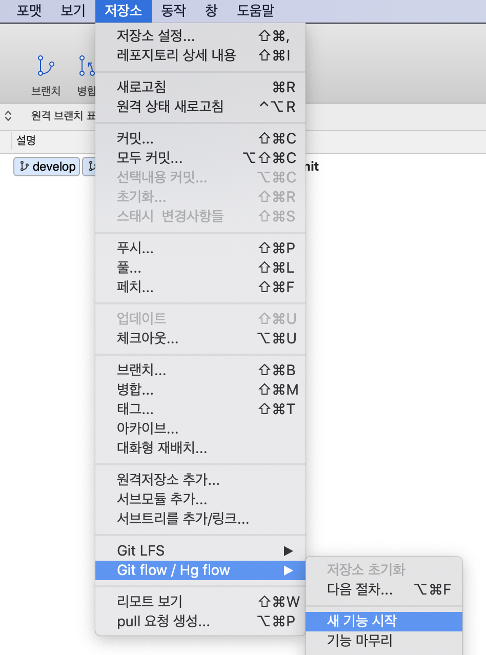 새 기능 시작을 하면 Develop 으로부터 Feature branch 를 생성합니다.