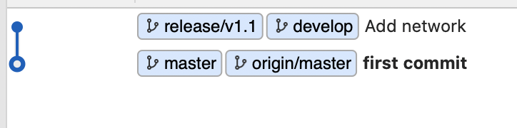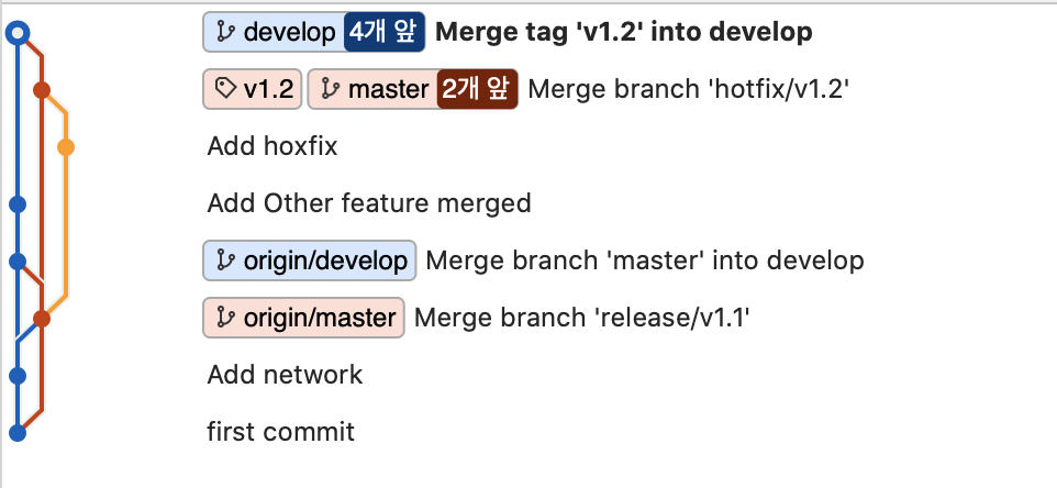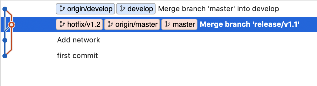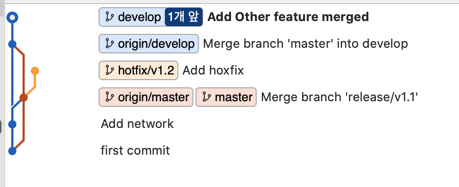 결과적으로 release/v1.1 브랜치가 삭제되며 develop 브랜치로 merge 되며 develop 으로 다시 돌려줍니다.