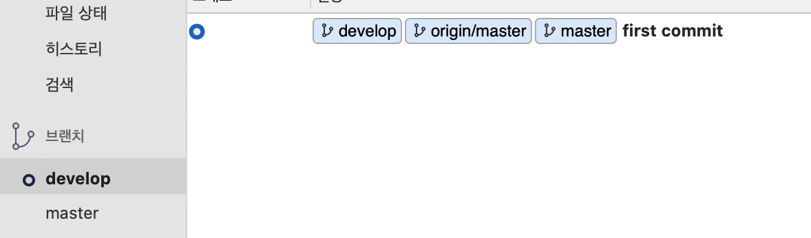 저장소 초기화를 실행하면 아래와 같이 develop 브랜치가 생성됩니다.