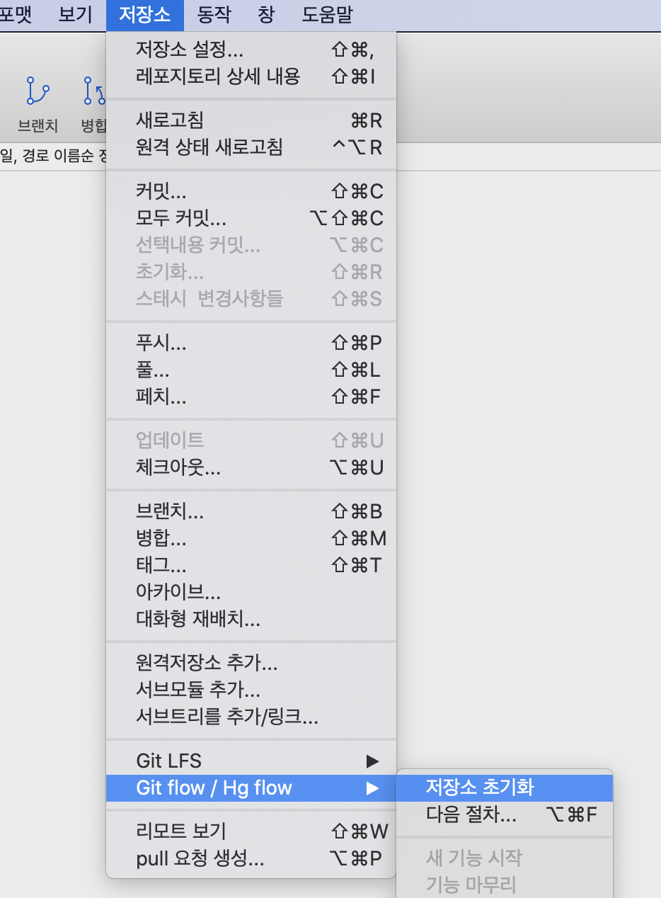 git flow 를 초기화 하기 위해선 아래 기능을 실행시켜야 합니다.