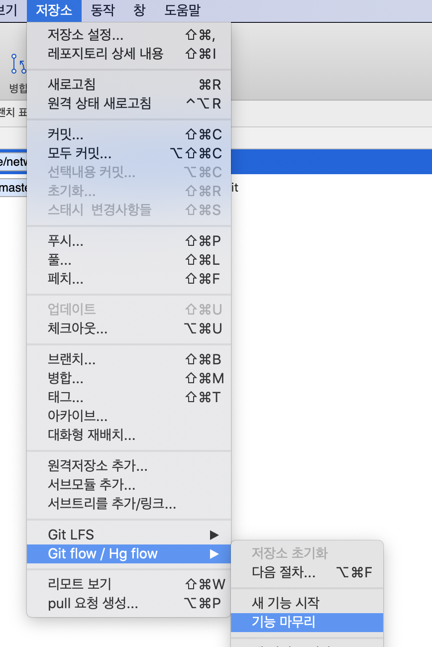 Feature 를 마무리할려면 기능 마무리를 실행하면 됩니다.
